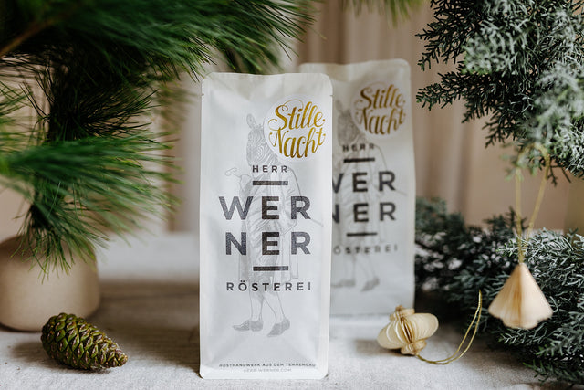 The Herr Werner Silent Night roast is a strong, full-bodied espresso blend made from the finest Arabica and Robusta beans. This coffee composition combines the taste of nougat with fine honey and spicy malt notes. A perfect winter coffee.
